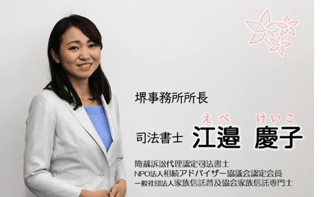 司法書士法人・行政書士法人C-first堺事務所 所長の江邉慶子(えべけいこ)と申します。